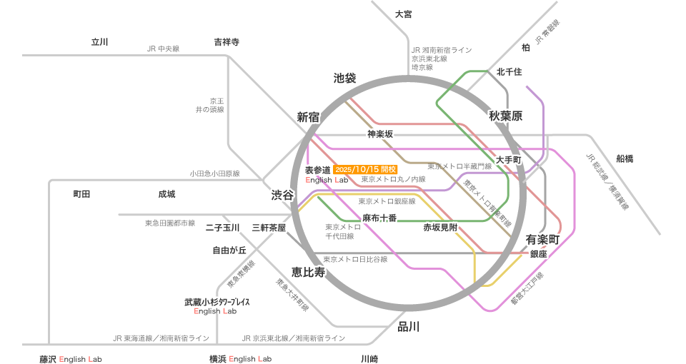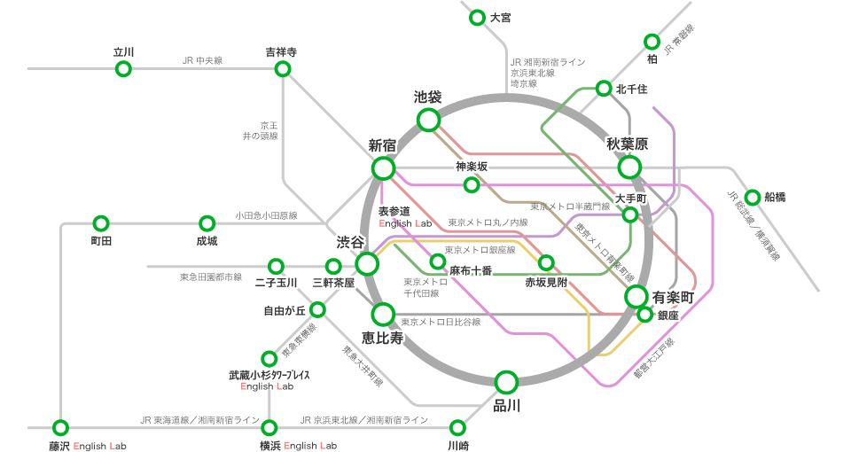 Gabaは、首都圏を中心に展開しています。駅に近く自宅や勤め先から通いやすいスクールがきっと見つかります。